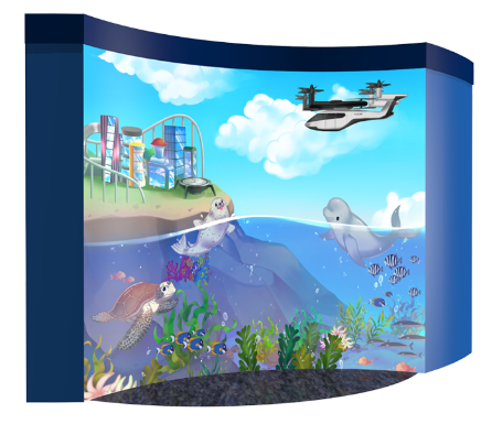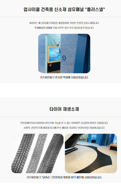 키즈마린테마파크는 국내 최초의 해양환경 이슈 전문 체험시설로 스토리 텔링을 적용한 전시공간과 환경오염을 실천하는 친환경 인테리어 소재로 꾸며져 있으며 미래의 교통수단과 에너지에 대해서 자세히 알 수 있도록 되어있습니다.