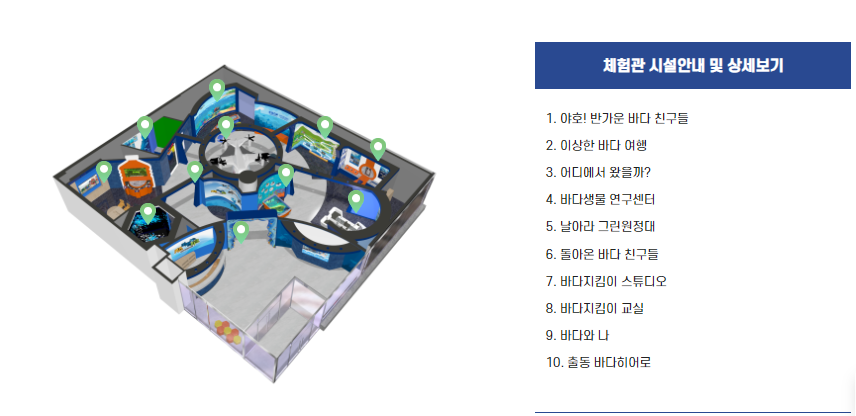 나와 해양의 상호관계를 이해하고 해양보전의 가치를 극대화하는 어린이 체험전시를 기본방향으로 아이들의 눈높이에 맞춰 지루하지 않고 다양한 체험을 통하여 최근 이슈 되는 해양오염의 심각성을 알리고, 해양환경 보호와 실천의 중요성을 자연스럽게 배울 수 있도록 조성되었습니다.